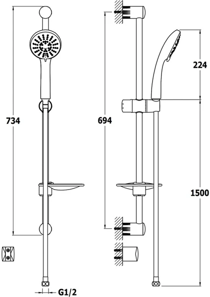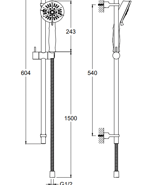 Malzeme: Pirinç; Duvardan monte, Sürgü Takımı, El Duşu, Sabit Askı dahil. ABS Spiral Hortum. Sürgü; Çap: 21 mm; Uzunluk: 604